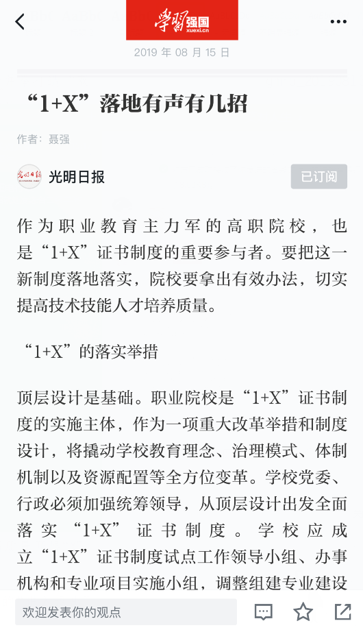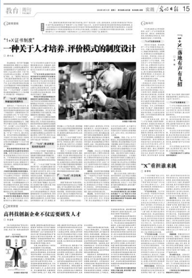 2019年8月13日,《光明日报》第15版《教育周刊·实践》,全文刊登了我校校长聂强教授撰写的学术文章——《“1+X”落地有声有几招》一文,8月15日,该文章被“学习强国”学习平台全文转载。