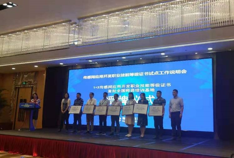 2019年9月25日,传感网应用开发职业技能等级证书试点工作说明会在福州召开,此次说明会由北京新大陆时代教育科技有限公司主办。教育部行政部门相关领导、行业企业及院校相关专家、拟申报传感网应用开发职业技能等级证书试点工作的院校负责人和学科带头人等300余人参加本次大会。会议现场揭晓了2019年“1+X传感网应用开发职业技能等级证书首批全国师资培训基地”并进行了授牌仪式,我校电子与物联网学院院长陈良作为学校代表上台接牌。