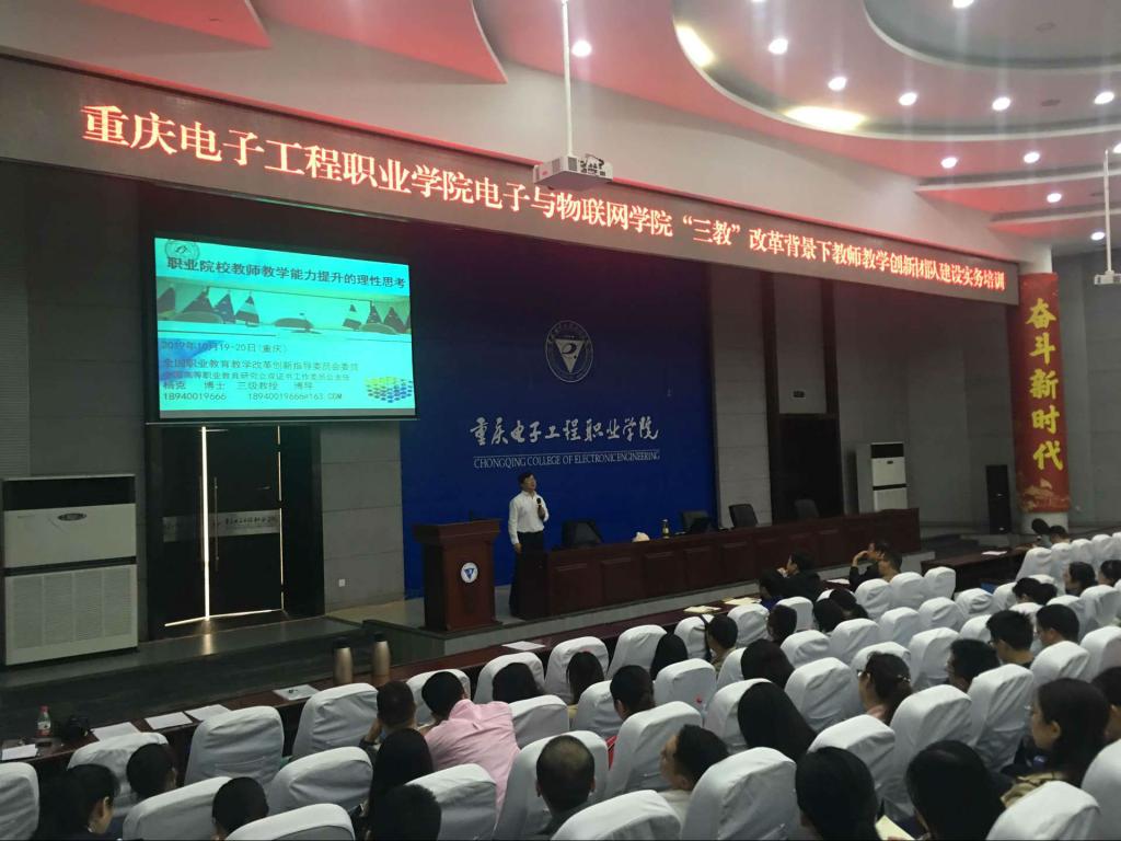 2019年10月19日-20日,电子与物联网学院特别邀请了全国职业教育专家、全国十佳科研工作者杨克教授为全校教师做“全国职业院校‘三教’改革背景下教师教学创新团队建设实务培训”,培训班在博远厅举行,电子与物联网学院、人工智能与大数据学院、建筑与材料学院、通信工程学院、智能制造与汽车学院,数字媒体学院以及重庆市万盛职业教育中心等200余人参培。