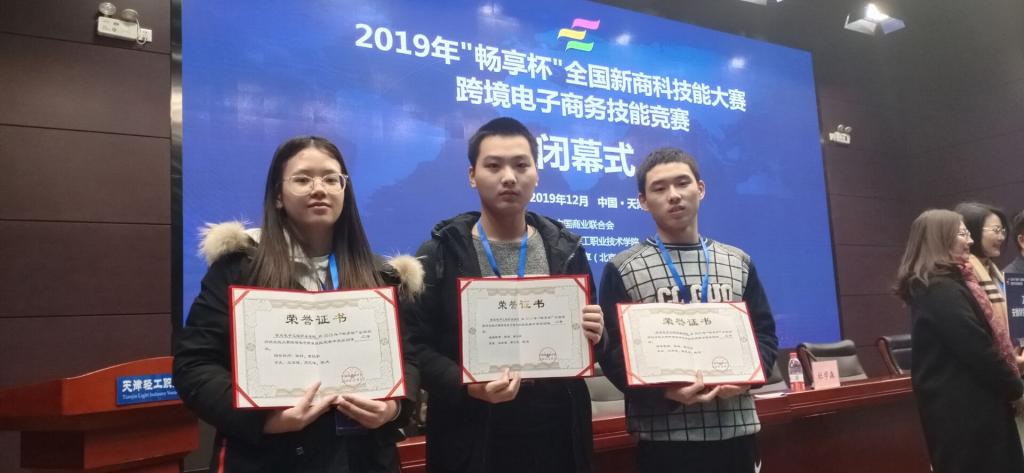2019年12月7日,"畅享杯"全国新商科技能大赛跨境电子商务技能竞赛全国总决赛在天津轻工职业技术学院举行,我院数字贸易专业群首次带队参赛,经过紧张激烈的角逐,国际经济与贸易专业的学生王学锋、高范洋、陈庆以良好的心理素质和扎实的专业技能,荣获团体二等奖。