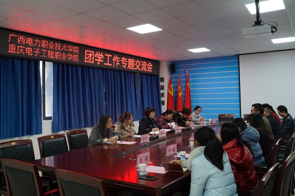 2019年12月12日上午,广西电力职业技术学院、重庆电子工程职业学院团学工作专题交流会在我校12-507A会议室顺利召开。广西电力职业技术学院团委书记、学生工作部副部长(主持工作)李洪丽一行6人,重庆电子工程职业学院团委书记袁玉刚及相关部门人员参加了本次交流会。