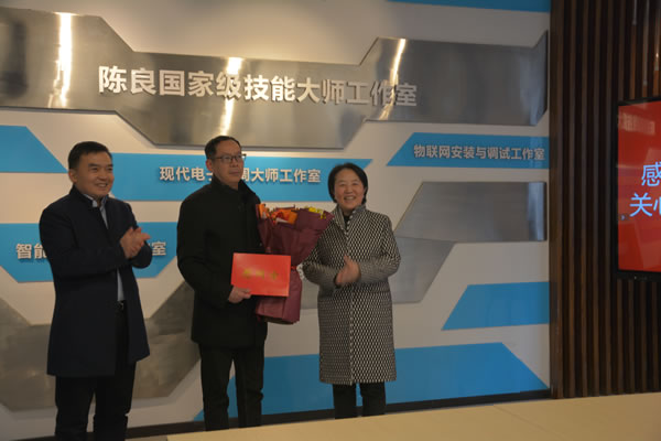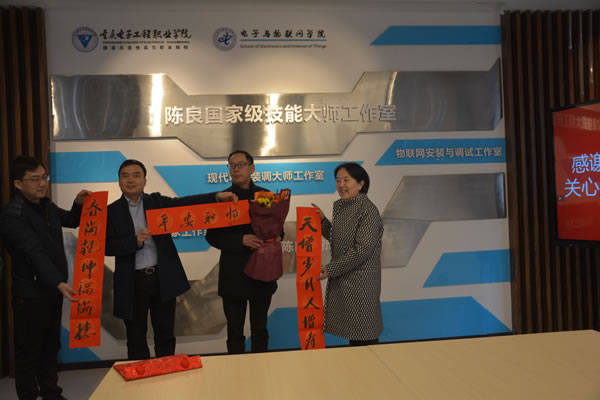 2020年1月16日下午,重庆市人力社保局局长陈元春一行来到我校陈良国家级技能大师工作室,慰问优秀高技能人才代表陈良教授,代表重庆市人社局送来慰问信、慰问金和新春祝福。我校校长聂强,副校长谢义华,电子与物联网学院部分代表参加了此次慰问活动。
