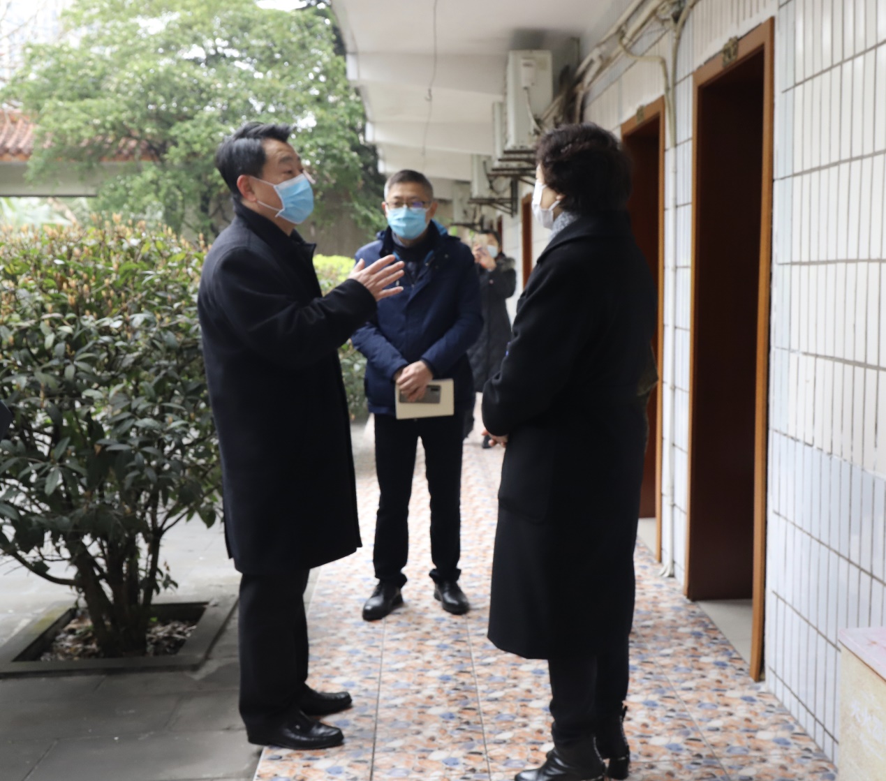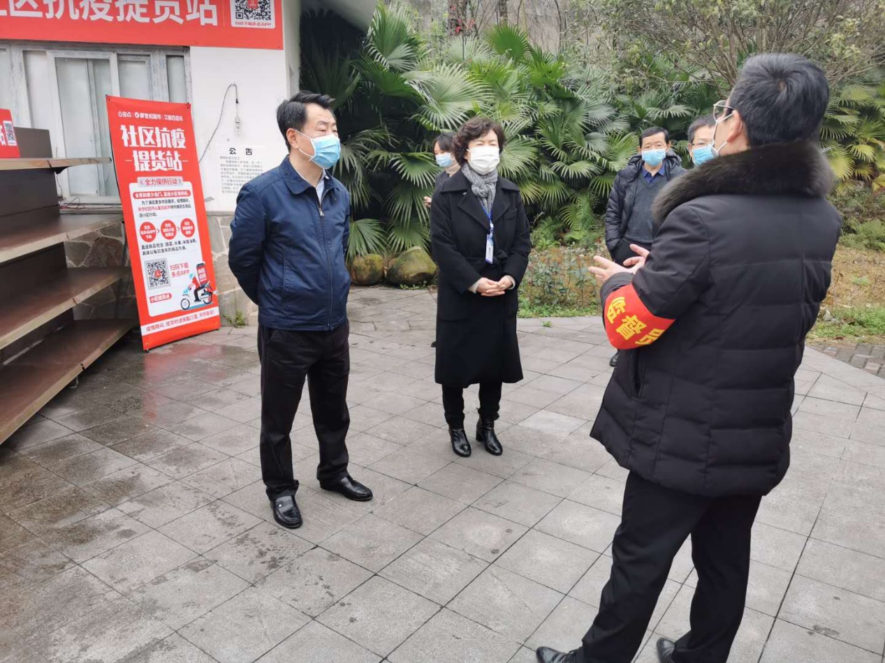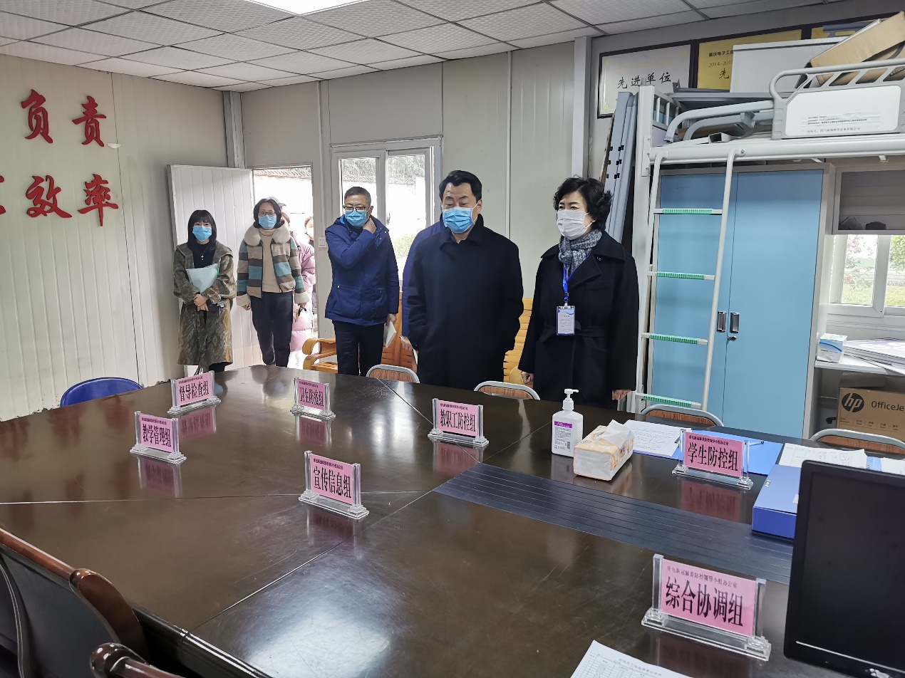 2月24日下午,沙坪坝区委常委、统战部部长蔡道静、区委统战部常务副部长江涛峰、陈家桥街道书记文刚、区疾控中心副主任支倩、陈家桥医院院长陈世斌一行来我校检查指导学校新型冠状病毒肺炎疫情防控工作。学校党委书记孙卫平、副校长冉学农、黄爱明,党委委员、宣传部长疏勤及疫情防控工作领导小组成员陪同检查。