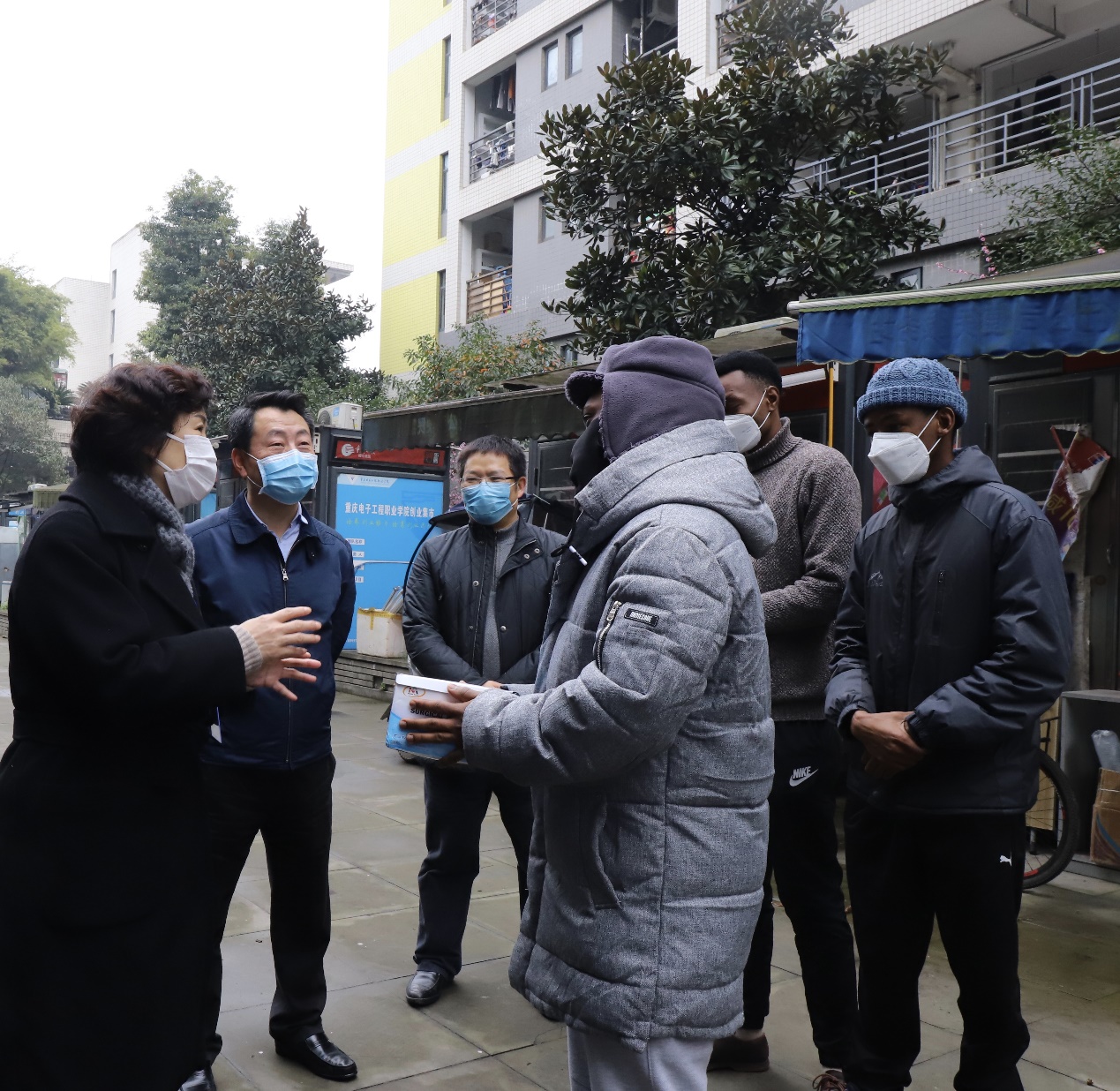 蔡道静一行实地检查了学校出入口、食堂、集中隔离点、学生宿舍、医务室、警务室、学校家属区等防疫工作,并对在校留学生进行了慰问,对坚守在一线的工作人员表示了感谢。