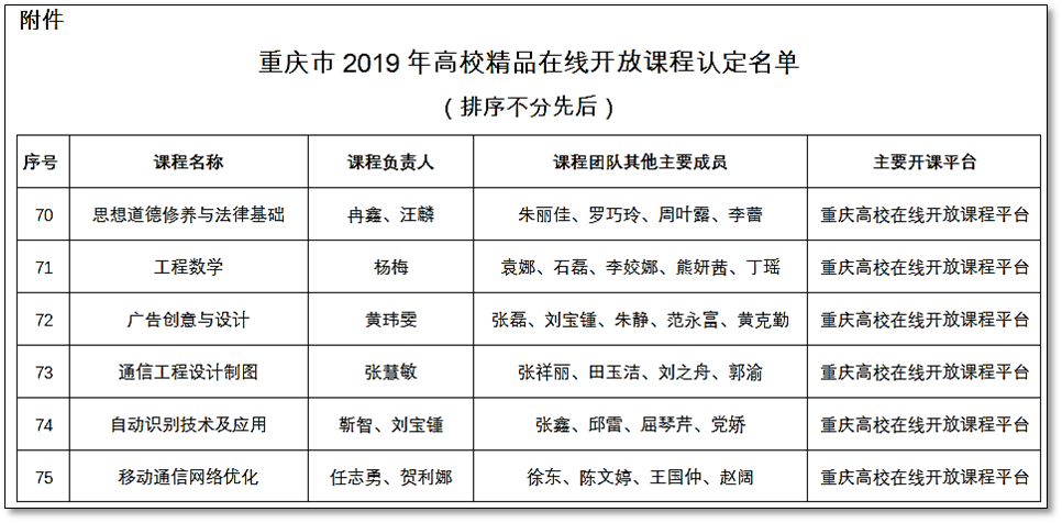 近日,重庆市2019年高校精品在线开放课程评审认定结果出炉,我校《工程数学》《移动通信网络优化》《广告创意与设计》《自动识别技术及应用》《思想道德修养与法律基础》《通信工程设计制图》6门课程入选“重庆市2019年高校精品在线开放课程”。