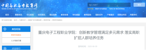 根据《教育部办公厅关于做好扩招后高职教育教学管理工作的指导意见》(教职成厅函〔2019〕20号)要求,教务处与应用技术学院认真总结典型经典做法并积极申报,学校《创新教学管理满足多元需求落实高职扩招人群培养任务》典型经验入选教育部职业教育与成人教育司在《中国高职高专教育网》汇集发布的典型案例。