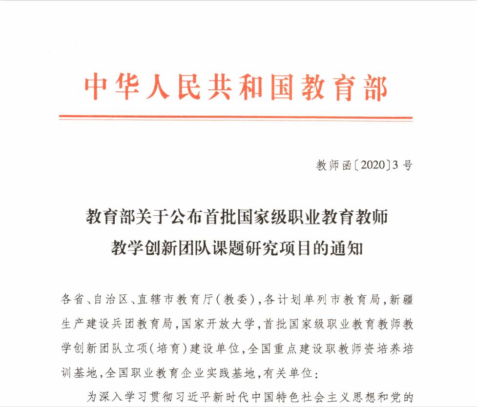 近日,《教育部关于公布首批国家级职业教育教师教学创新团队课题研究项目的通知》(教师函[2020]3号)下发,电子与物联网学院《新时代高等职业院校物联网技术专业领域团队教师教育教学改革创新与实践》成功立项重点课题,并为该领域牵头单位。