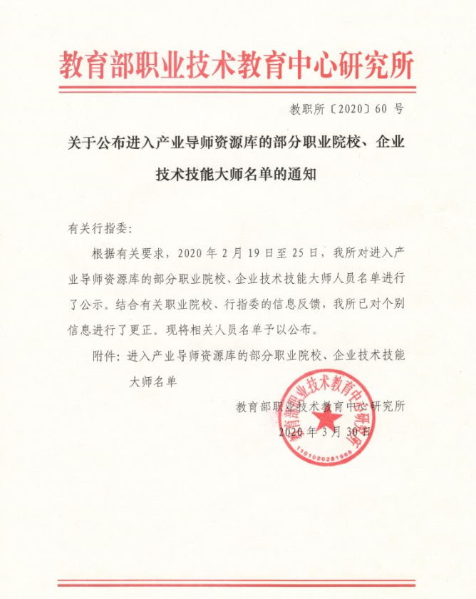 日前,教育部职业技术教育中心研究所公布了入选产业导师资源库的部分院校、企业技术技能大师名单,我校国家级技能大师工作室陈良教授成功入选工信行指委产业导师资源库,同时全国仅有8所高校进入该产业导师资源库。