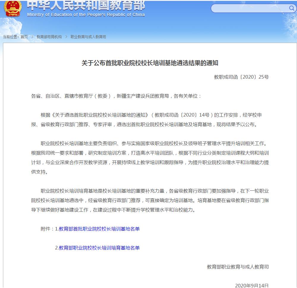 根据《关于公布首批职业院校校长培训基地遴选结果的通知》(教职成司函〔2020〕25号),经学校前期申报、省级教育行政部门推荐、专家评审,我校成功入选职业院校校长培训培育基地。未来,我校将继续积极申报各类校长培训项目,扩大我校培训品牌影响力,为双高建设添砖加瓦。