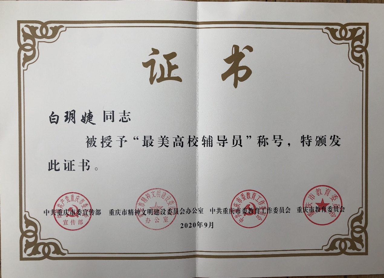 为大力培养选树新时代高校辅导员先进典型,激发广大辅导员的荣誉感、责任感、使命感,根据市委教育工委、市教委印发的《关于开展重庆市最美高校辅导员学习宣传活动的通知》文件精神,我校智能制造与汽车学院教师白玥婕被授予“2020年重庆市最美高校辅导员”称号。