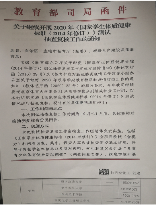 依据《教育部办公厅关于印发〈国家学生体质健康标准(2014年修订)〉测试抽查复核工作实施方案的通知》(教体艺厅函[2016]39号)及《教育部应对新冠肺炎疫情工作领导小组办公室关于做好2020年秋季学期教育教学和疫情防控工作的通知》(教体艺函[2020]22号)的相关要求,2020年11月13日教育部体卫艺司《国家学生体质健康测试》抽查复核工作组对我校体质健康测试工作进行抽查复核。抽查样本量为大一、大二、大三各60人共180人,其中男女各90人。抽查复核结果为:男子合格率95.56%、女子合格率:94.44%。顺利完成2020年《国家学生体质健康标准》测试抽查复核工作。