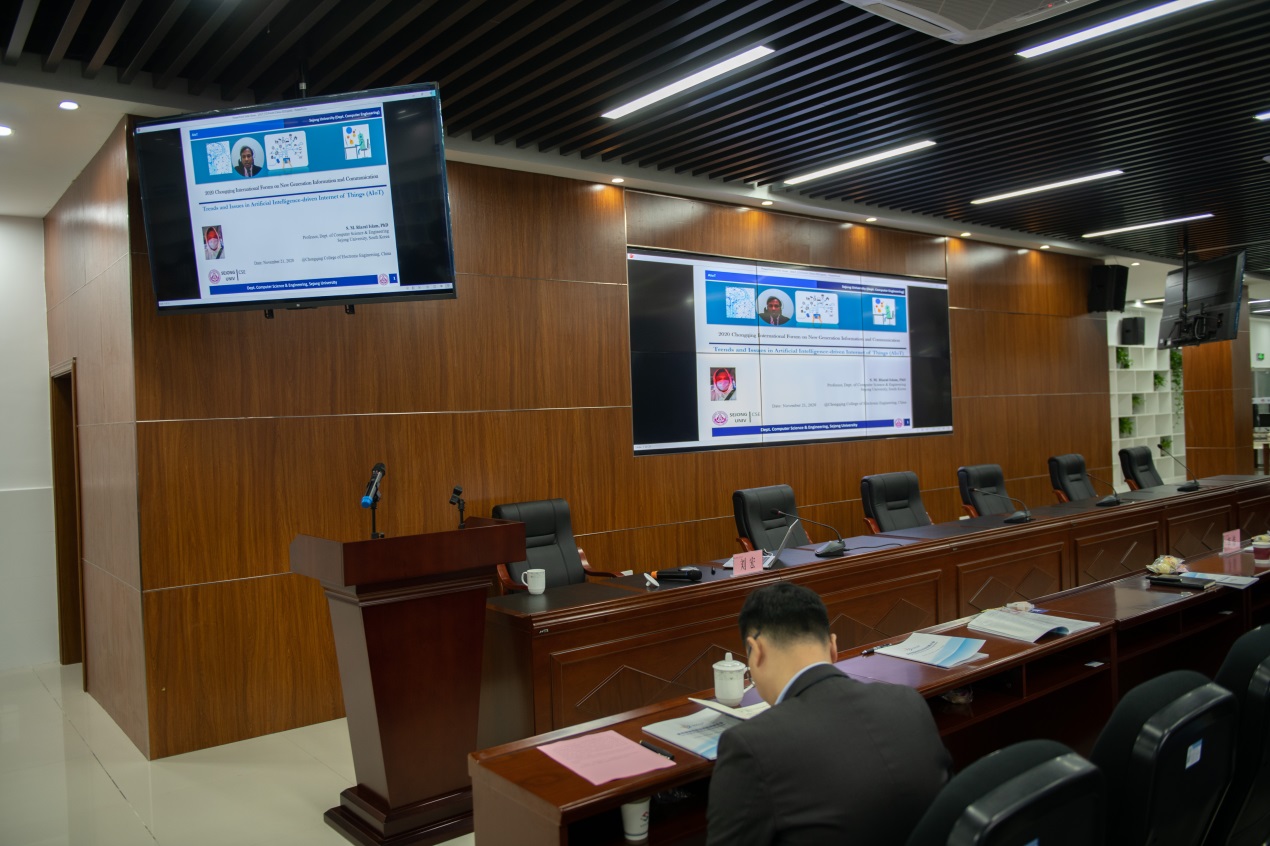 下午,论坛由重庆邮电大学通信与信息工程学院王洋教授主持。5G+AI+IOT时代已经到来,以英国谢菲尔德大学张杰教授做《5G网络规划优化》在线讲座报告为始,接着大唐高鸿李炜专家《车联网C-V2X及自动驾驶技术架构》,北京大学刘宏教授做《面向公共服务机器人的新一代AI技术》,最后以韩国世宗大学S.M. Riazul Islam教授的《Trends and Issues in Artificial Intelligence-driven Internet of Things (AIoT)》在线讲座报告为终,给现场听众留下深刻印象。