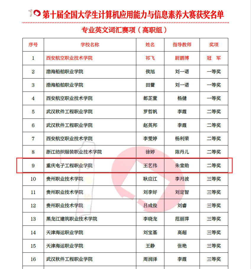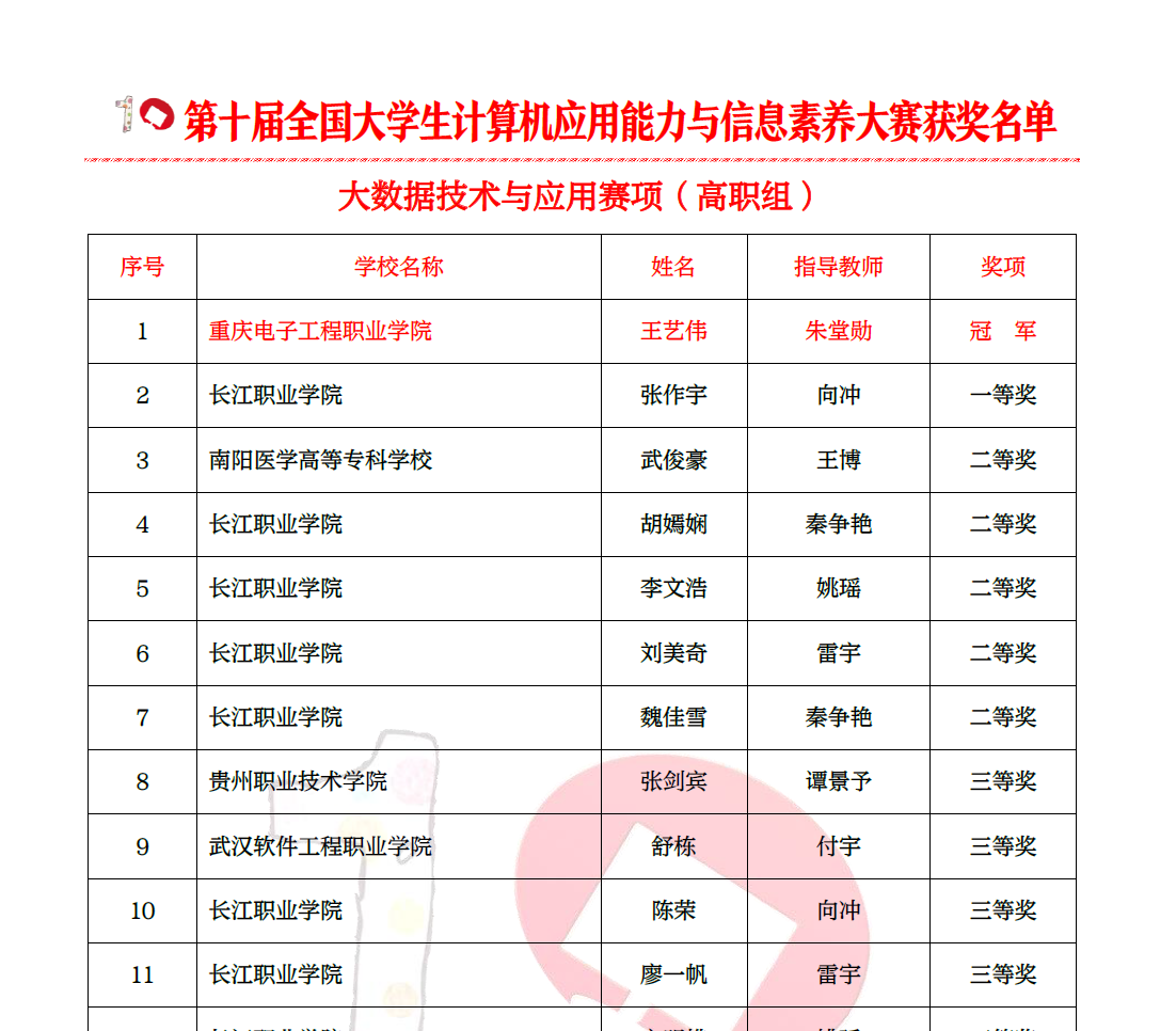 历时9天的第十届全国大学生计算机应用能力与信息素养大赛全国总决赛于2020年11月底圆满结束。我校人工智能与大数据学院人工智能技术服务、移动互联应用技术专业骨干教师朱堂勋、胡云冰指导的王艺伟及严杰两名同学在大数据技术与应用赛项分获一等奖和三等奖,在计算机专业英文赛项中获得二等奖和三等奖各一项。