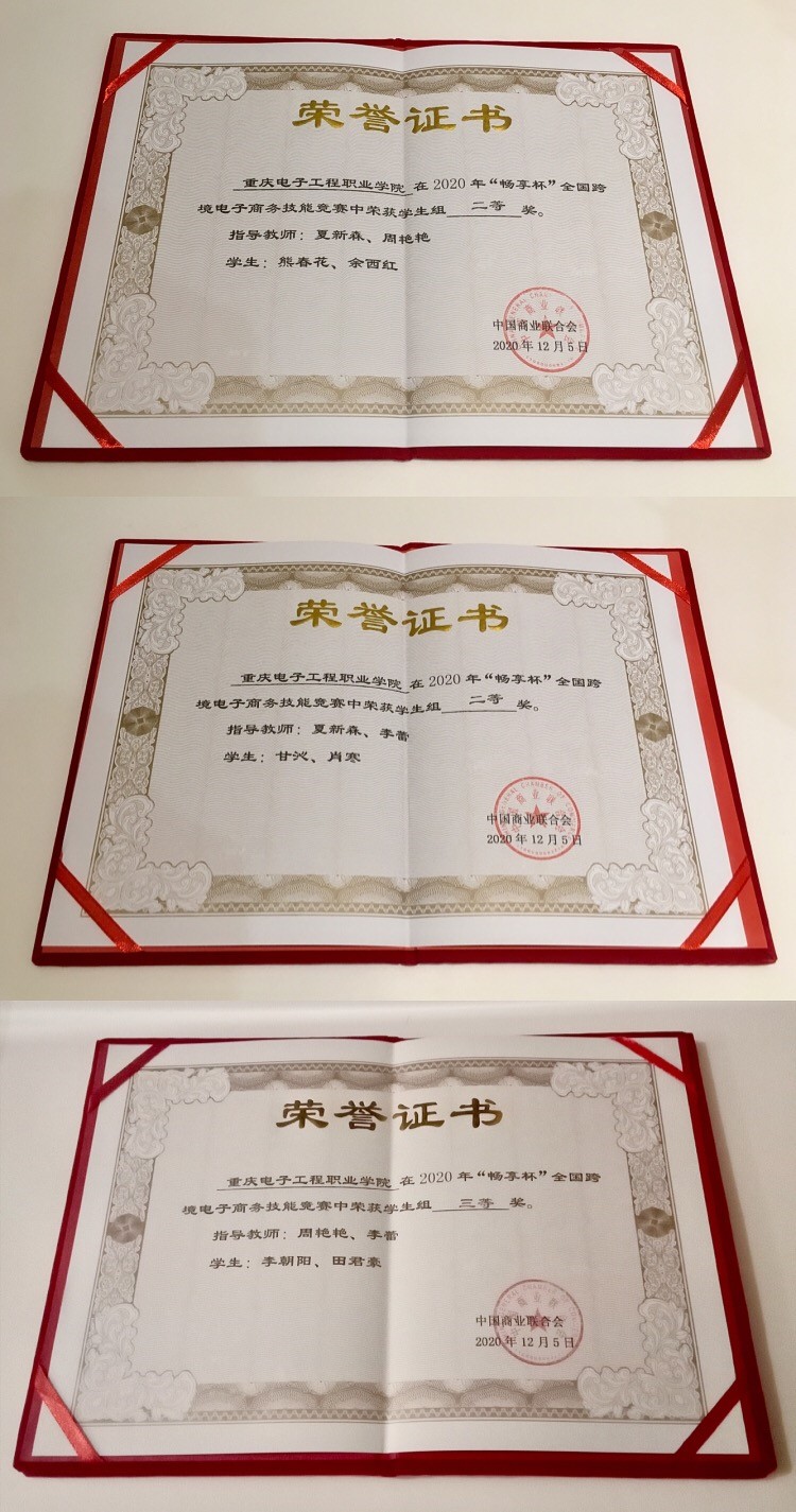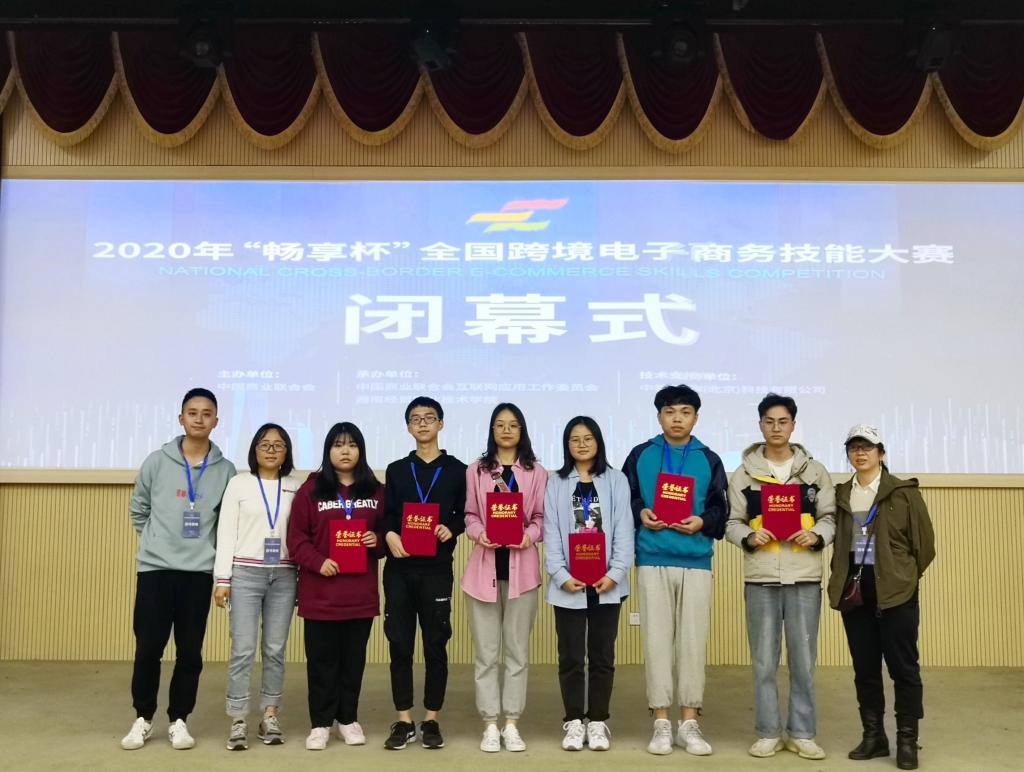 12月5日,2020年“畅享杯”全国跨境电子商务技能竞赛总决赛在海口落下帷幕。大赛由中国商业联合会主办,中国商业联合会互联网应用工作委员会和海南经贸职业技术学院联合承办。来自全国各大院校的80支参赛队经过4个小时的激烈比拼,我校电子与物联网学院电子产品营销与服务专业的熊春花、余西红、甘沁、肖寒、李朝阳、田君豪等六位同学组成的三支参赛队,在夏新森、周艳艳、李蕾三位老师的指导下,分别获得两个二等奖、一个三等奖的优异成绩。