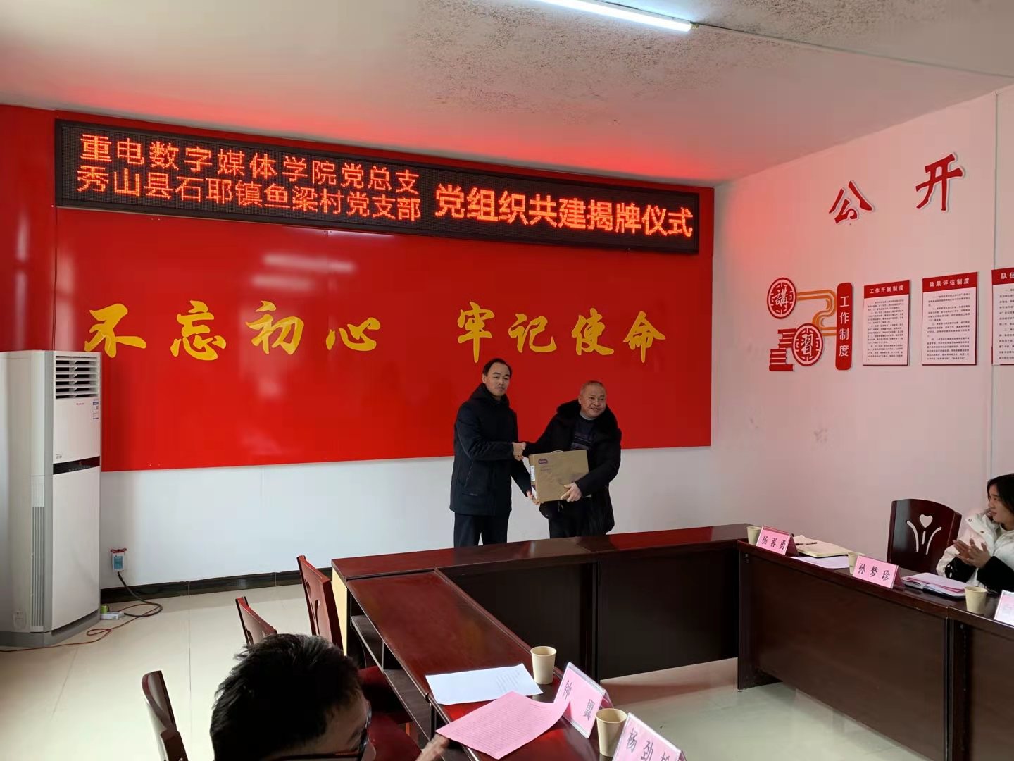 会上,重庆电子工程职业学院向鱼梁村村委会赠送用于开展党员远程教育和互动的多功能投影仪,学校冉学农副校长和秀山县县委组织部常务副部长杨再庆共同为“党组织共建单位”揭牌。