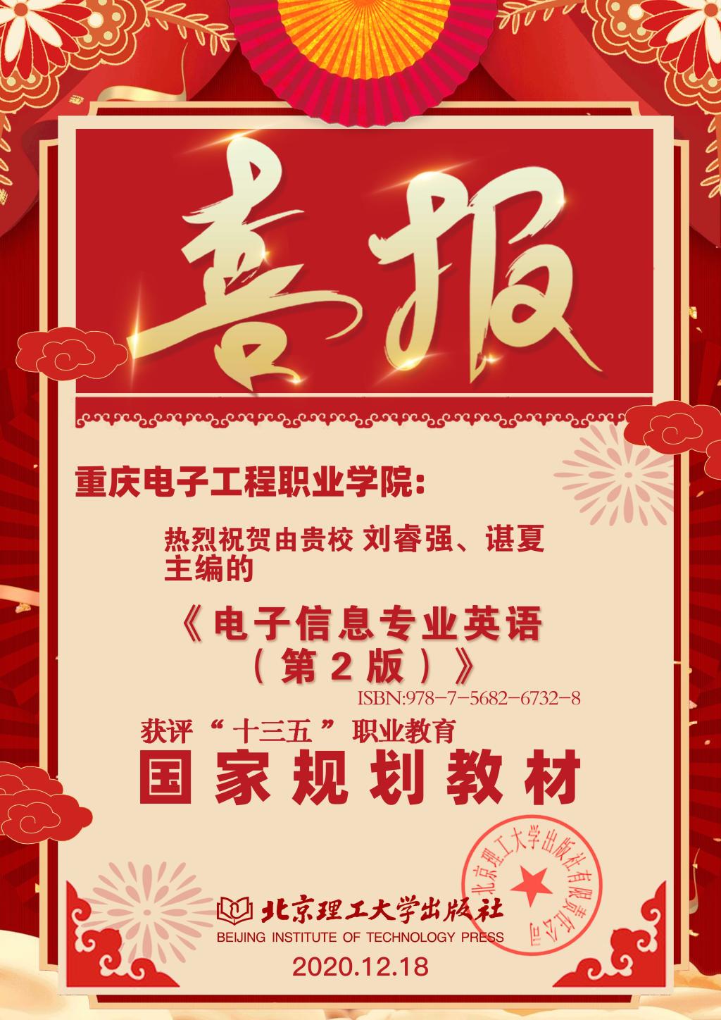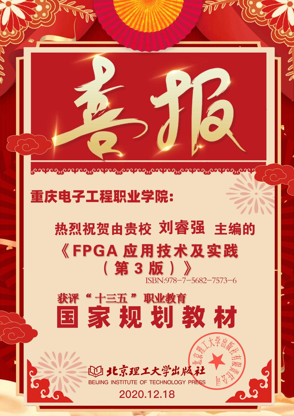 为贯彻《国家职业教育改革实施方案》,落实《职业院校教材管理办法》,不断加强职业院校教材建设,教育部职成司印发《关于组织开展“十三五”职业教育国家规划教材建设工作的通知》等文件。经有关单位申报、形式审查、网络和会议评审等程序,共有3975种教材入选“十三五”职业教育国家规划教材书目。2020年12月,教育部办公厅公布了“十三五”职业教育国家规划教材书目,我校微电子技术专业两种教材入选“十三五”职业教育国家规划教材,分别是刘睿强、谌夏等主编的《电子信息专业英语》,刘睿强、尹洪剑、冀云等主编的《FPGA应用技术及实践》。