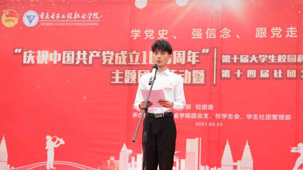 3月25日,重庆电子工程职业学院“学党史、强信念、跟党走”庆祝中国共产党成立100周年主题团日活动暨第十届大学生校园科技文化艺术节和第十四届社团文化艺术节开幕式在南校区学子广场顺利举行。校党委副书记龚小勇,党委委员、党委组织统战部部长刘洪光,党委委员、党委宣传部部长疏勤,相关职能部门负责人以及各二级学院党总支书记、团总支书记出席了本次活动,二级学院学生代表共计240余人参加了本次活动。