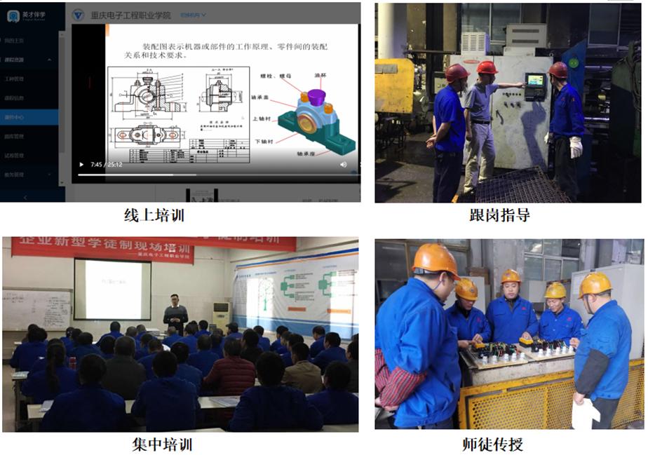 经过近一年的探索,校企构建“线上自学+跟岗指导+集中培训+师徒传授”的四位一体企业新型制培训模式,即学员在线上平台上完成各工种的基础理论知识学习,并通过线上测试;学校培训师到生产现场对员工进行跟岗指导,发现问题,现场解决问题;培训师根据跟岗指导时收集的素材,开发课件,通过集中培训的方式,与员工分享交流;员工把学习到的知识应用到岗位上,并接受师傅的技艺传授。通过以上四个环节,相辅相成,达到促进渝江技能人才培养,壮大发展产业工人队伍的目的。