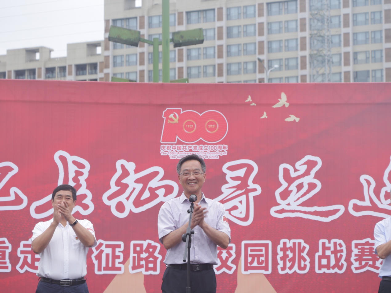 在“红军不怕远征难,万水千山只等闲”的朗诵声中,活动开幕式在北校区篮球场正式拉开帷幕。党委委员、组织统战部部长刘洪光为挑战赛进行授旗,刘成俊副校长宣布活动正式开始。