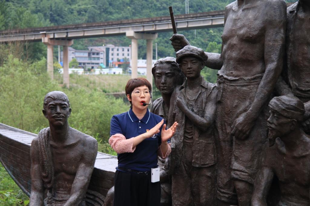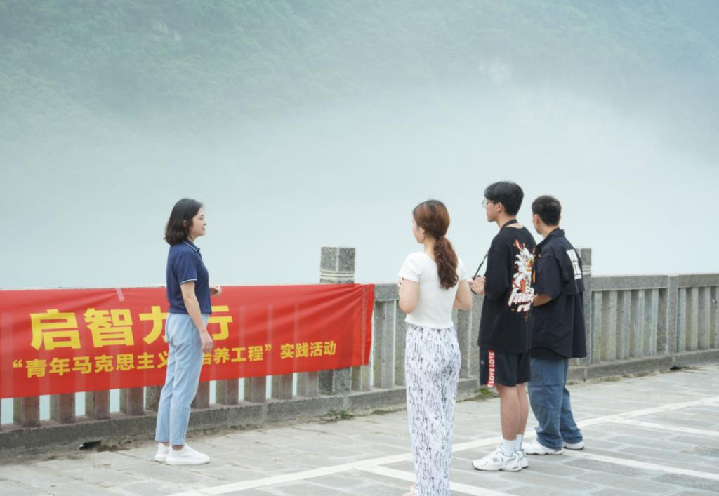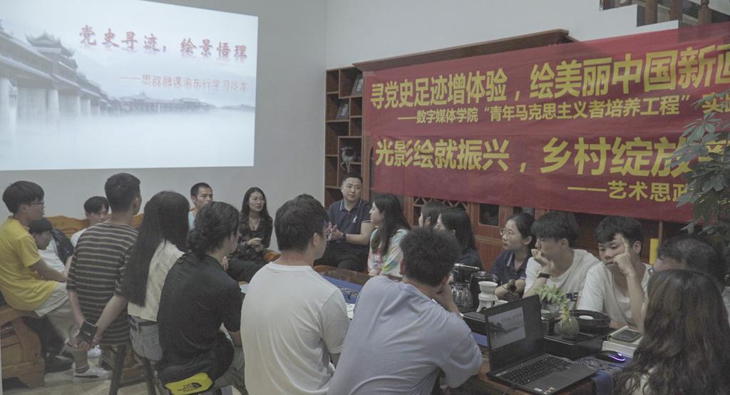 在龚滩古镇,思政课专业教师、兼职辅导员程媛与学员们领略乌江画廊自然风光的同时,带着学员探寻了龚滩古镇的红色足迹,为学员们讲述了解放军1949年11月解放龚滩的故事;在濯水古镇,思政课专业教师、兼职辅导员余秀平、杜鹤淦,带着学员走进濯水古镇“红军渡”,了解贺龙于1934年5月度过阿蓬江的故事。通过带领学员亲自走过红色足迹,体验党史温度,为学员完成的专业作品注入党史温度。同时,经过实地感受,理论教学,学员们深刻理解到“中国共产党为什么能”,在数字媒体学院团总支书记吴艾佳的带领下,学员们唱起了《唱支山歌给党听》。