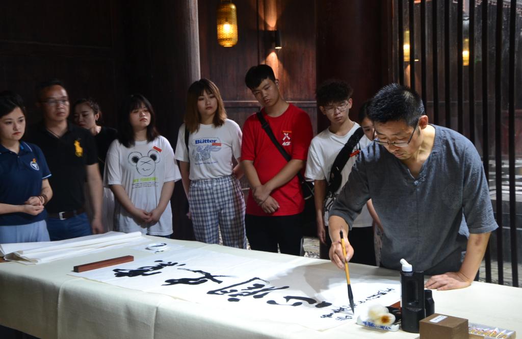 在酉阳龚滩古镇,马克思主义学院形势与政策教研室主任周叶露老师和数字媒体学院专业教师罗淞译带领学员们追寻着著名画家吴冠中的足迹,帮助同学们理解吴冠中为何说龚滩古镇“是唐街,是宋城,是爷爷奶奶的家”。从这句话为学员们探寻龚滩古镇的前世今生,理解龚滩古镇的历史底蕴,认识改革开放以来龚滩古镇的移民文化,为学员们完成的专业作品增加深厚的文化温度。在龚滩美术馆,专业教师范永富现场教授学员书法技巧。