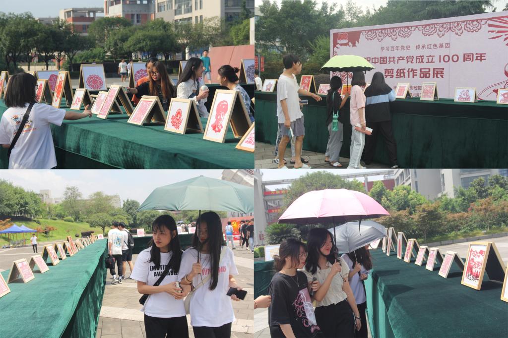 为庆祝中国共产党成立100周年,深入开展党史学习教育,激发全院师生知史爱党、知史爱国的情怀,引导青年了解党的光辉历史、感悟党的初心使命、传承党的红色基因,弘扬优良传统,丰富校园文化生活。2021年6月30日,重庆电子工程职业学院财经管理学院在学子广场举办了“学习百年党史,传承红色基因”庆祝中国共产党成立100周年剪纸作品展览。本次活动吸引了全院千余名大学生参与创作,共展出优秀作品110余幅。