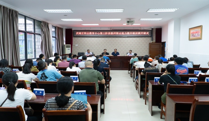 2021年7月4日上午,重庆市2020年度精准扶贫项目武隆职业教育中心第三阶段教师职业能力提升培训班在我校南校区1-101室举行,武隆区职业教育中心党总支书记、校长陈晓平,副校长高龄,培训与继续教育中心主任陈志军,以及来自武隆职业教育中心的50名学员参加开班式,开班式由国培基地办副主任张亚主持。