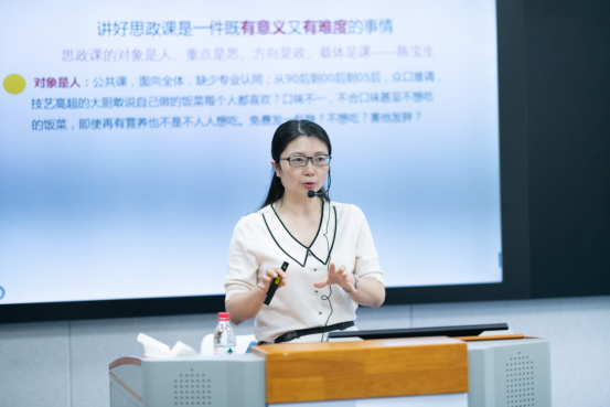 兰桂萍副教授从事思政课教学多年,有着丰富的教学经验和成果,是全国高校思政课教学标兵、全国高校思政课影响力提名人物、重庆市高校思政课教学比赛一等奖。本次讲座兰教授从影响教学效果的因素出发同与会教师一起探讨如何提高思政课“含金量”打造思政金课堂;她从转变教学观念、改造教学内容、优化教学过程、革新教学语言等课堂教学要素出发系统提出打磨思政金课堂的方法。强调教学设计要践行以学生为中心原则,多以问题导向激发学生自主参与,教学案例等要紧跟时代发展,摒弃陈旧老化、老生常谈,教学语言要准、精、新,兰教授讲座激情澎湃、妙语连珠,在场教师纷纷表示受益匪浅,现场掌声不断。
