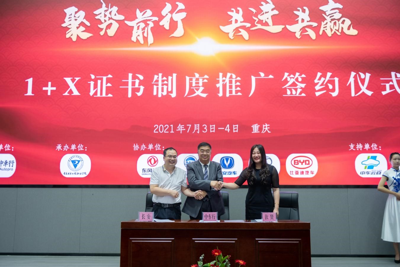 北京中车行高新技术有限公司董事长曹之明与重庆长安汽车股份有限公司人力资源部经理王武生、重庆钦贤教育科技有限公司总经理李燕出席签约仪式