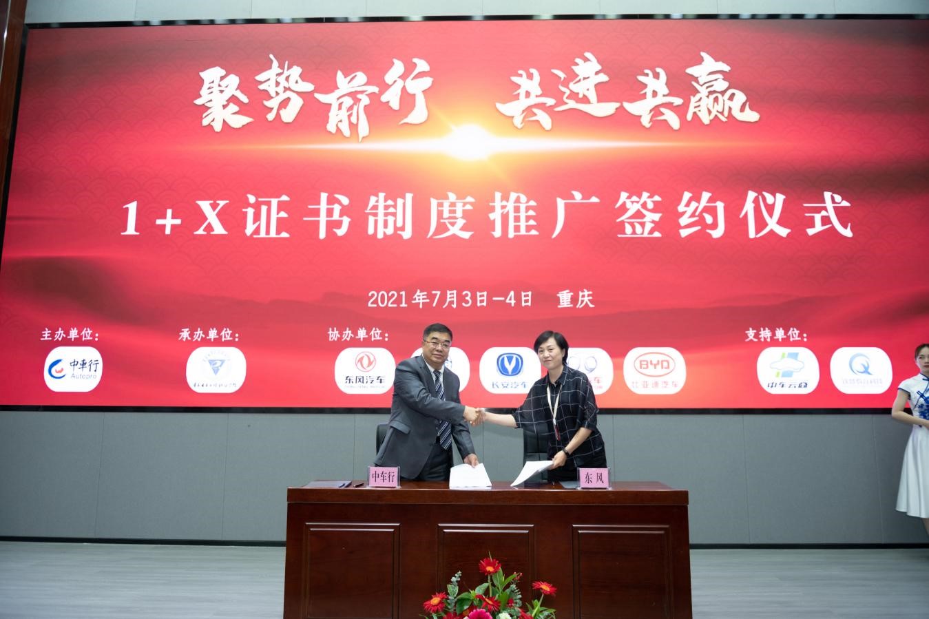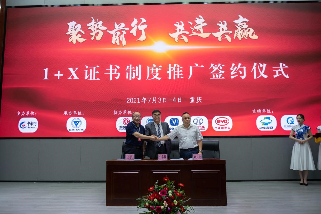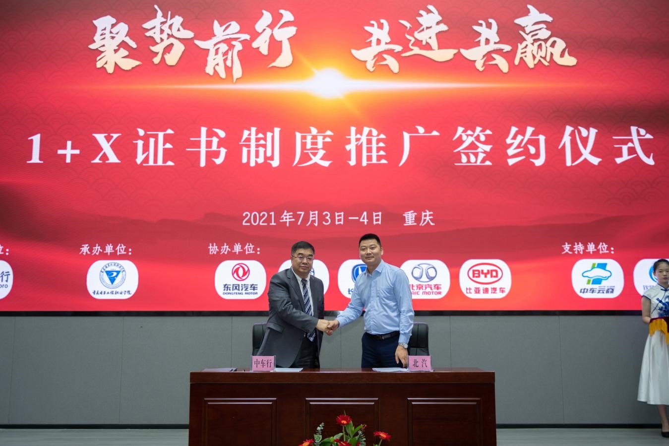 7月3日上午,北京中车行高新技术有限公司与东风集团有限公司、上海汽车集团股份有限公司、重庆长安汽车股份有限公司、北京汽车蓝谷营销服务有限公司和厦门金龙联合汽车工业有限公司等五家国内龙头汽车制造企业分别举行了1+X证书制度推广签约仪式,全面贯彻落实全国职业教育大会精神,力图深化加快产教融合进程,推进校企合作力度,促进1+X证书制度试点工作在企业方向推广,实现复合型技术技能人才高质量就业。