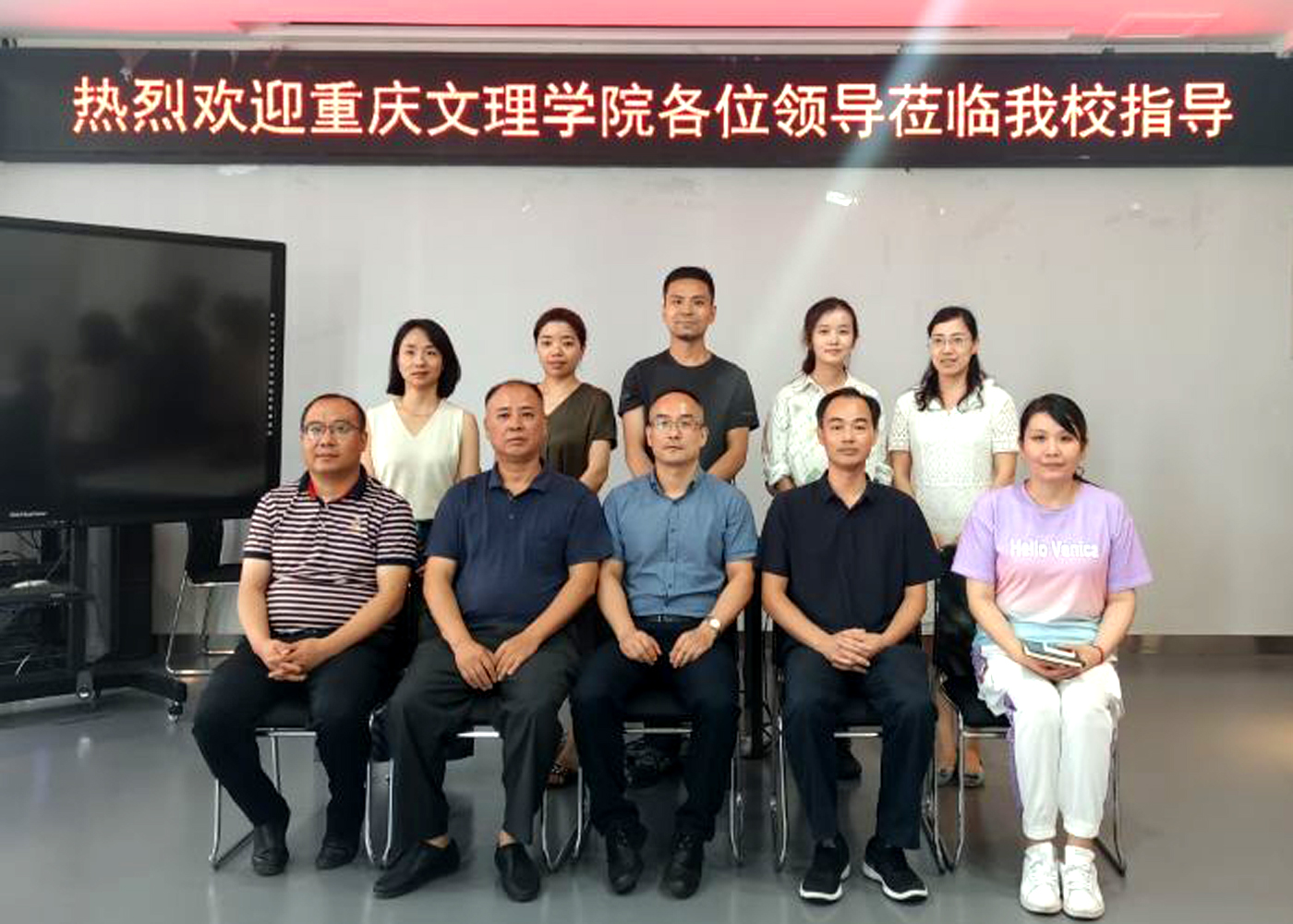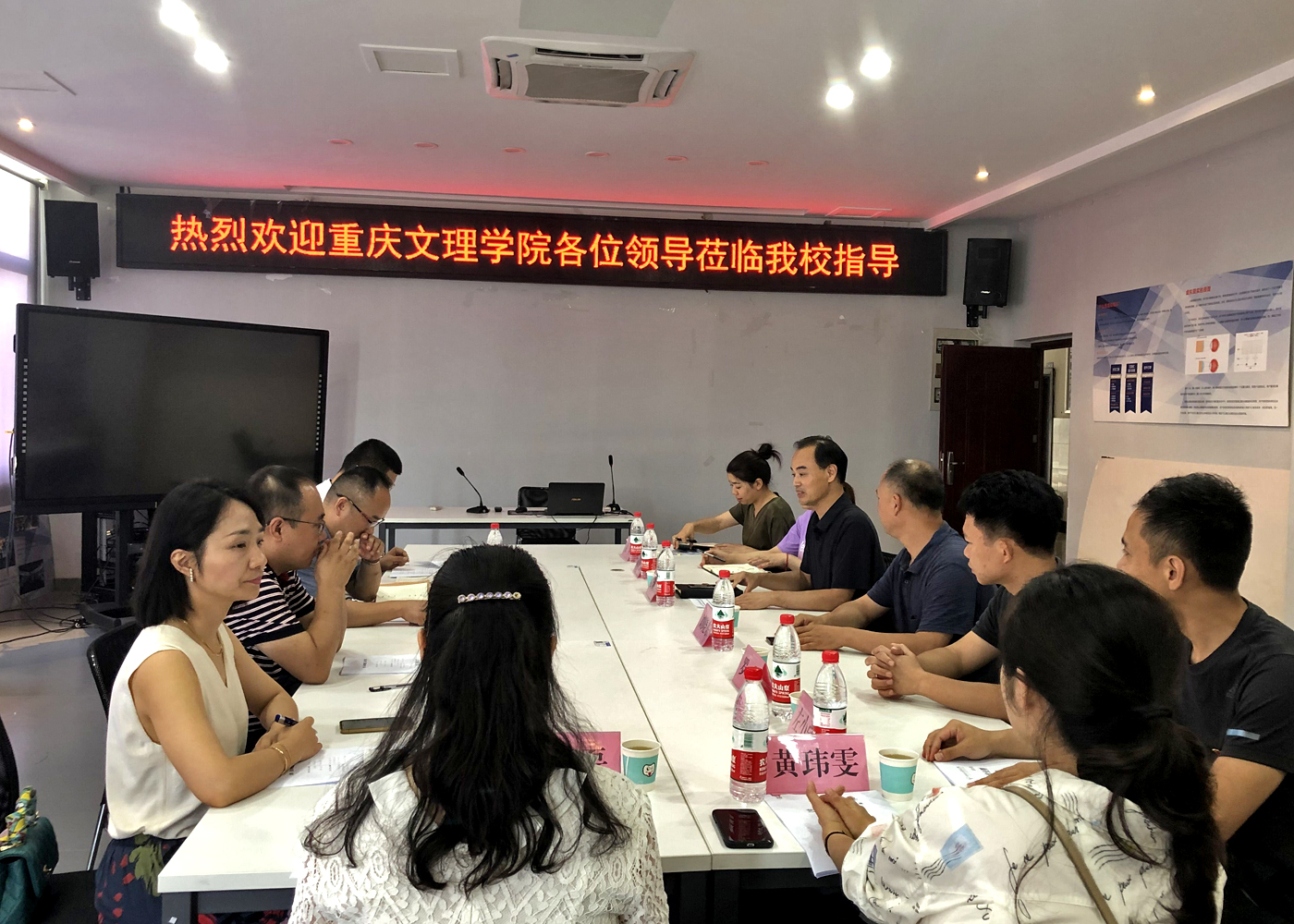 2021年7月12日下午,重庆文理学院旅游学院院长王瑞胡一行,前来我校数字媒体学院就专业建设和产教融合事宜进行交流座谈。数字媒体学院党总支书记彭海深、院长刘晓东、副院长谢永、艺术设计系主任左小强、艺术设计系副主任黄玮雯、影视动画系主任罗坚、虚拟现实系主任袁琴、专业教师张磊参与座谈。