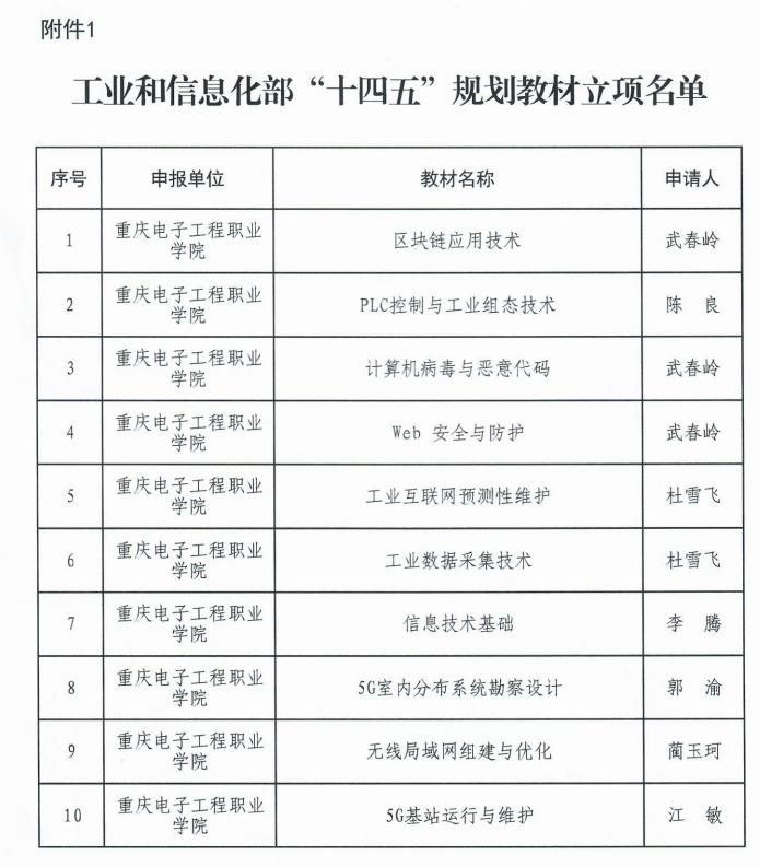 近日,接《工业和信息化部关于“十四五”规划教材立项建设的通知》(工信部人[2021]116号),工业和信息化部组织开展了教材立项的评选工作,此次经学校申报、形式审查、专家评审,工业和信息化部审核批准“十四五”规划教材立项。我校10部教材获工业和信息化部“十四五”规划教材立项,这是我校开展“双高建设”和“提质培优计划”工作以来取得的又一教材建设重要成果。