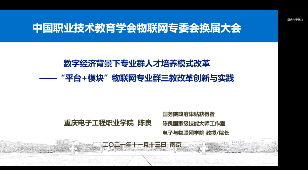 11月13日,中国职业技术教育学会智慧物联网专业委员会第二次会员大会在线上举行。会议第三阶段,开展了“5G+物联网”数字化人才培养论坛,电子与物联网学院院长陈良教授在论坛上分享了我校物联网专业群人才培养模式的改革实践方案。