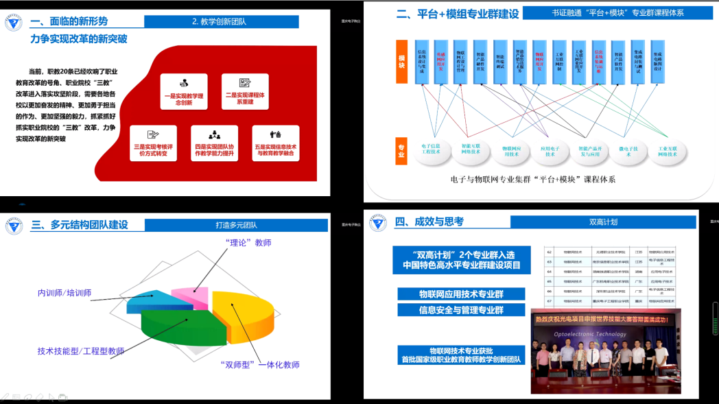物联网专业群人才培养模式的改革是我院在新形势下“三教改革”的重大创新与实践。通过在中国职教学会物联网专委会会员大会上的分享交流,得到了学会、行业、兄弟院校们对我校人才培养模式改革的充分认可,对我校物联网专业群品牌的宣传及物联网专业群人才培养模式的推广具有重要意义。