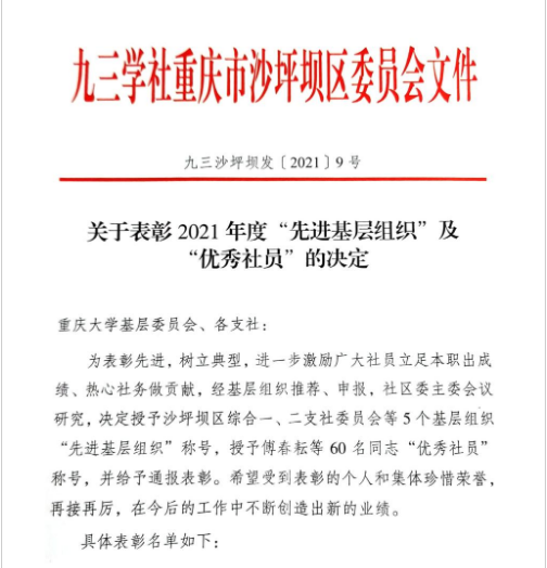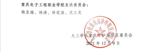 2021年,在重庆电子工程职业学院党委指导下,九三学社重庆电子工程职业学院支社全体社员齐心协力、认真履职,获得本年度九三学社沙坪坝区委“先进基层组织”。陶亚雄、林涛、许定洁、沈玉文四名社员同志获得九三学社沙坪坝区委“优秀社员”。