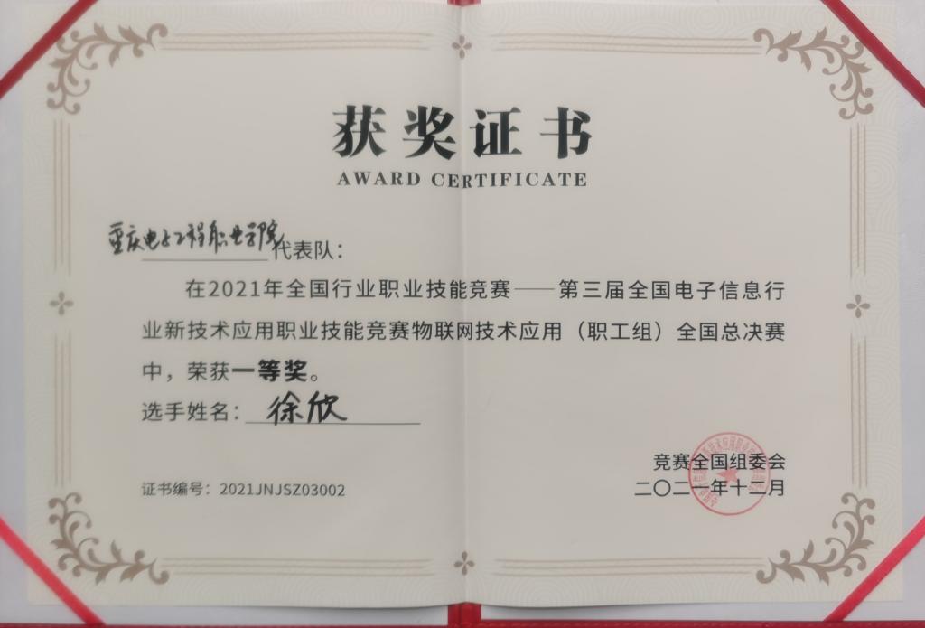 12月18日-19日,由中国电子质量管理协会、中国就业培训技术指导中心主办,中国电子质量管理协会虚拟现实专业委员会、河北省人社厅、涿州市政府、保定市人社局、涿州市技师学院等共同承办的2021年全国行业职业技能竞赛——第三届全国电子信息行业新技术应用职业技能竞赛(物联网技术应用赛项)全国总决赛在涿州市技师学院举行。大赛共有来自全国十余个省市自治区的47支代表队参加。我校电子与物联网学院物联网应用技术专业教师徐欣获全国总决赛一等奖。