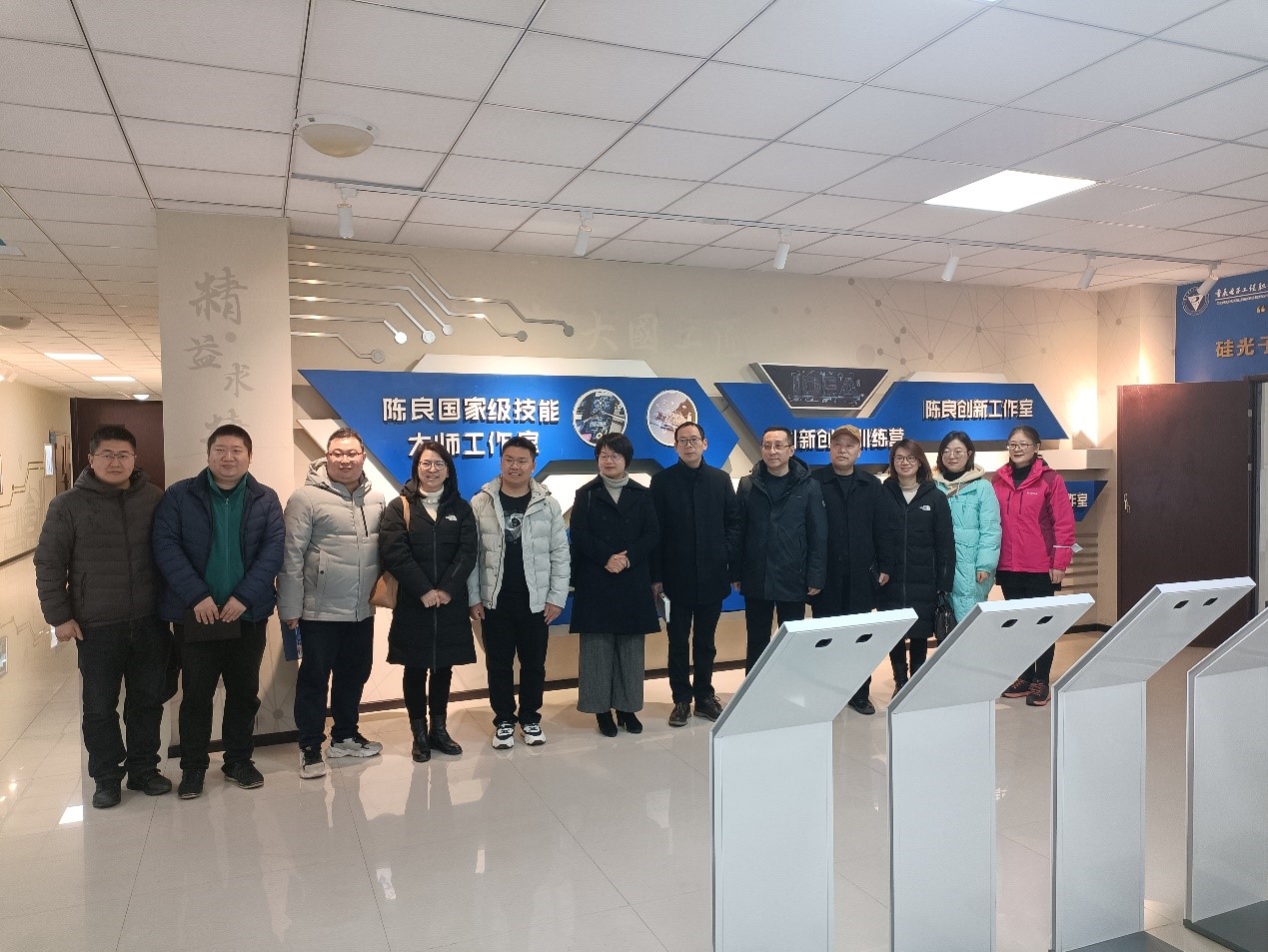 在电子与物联网学院院长陈良、工作室常务副主任武新、工作室副主任李大年、刘京威、张轻越等陪同下,党委书记刘宗丽一行参观了大师工作室的各个环节部门。