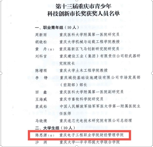 为深入学习贯彻习近平总书记关于科技创新的重要指示精神,鼓励全市职业青年、大学生、中小学生积极参与科技创新活动,促进青少年科技创新后备人才培养,营造热爱科学、崇尚创新的社会氛围。重庆市人民政府经在全市范围遴选、评审、考察,最终决定授予30人第十三届重庆市青少年科技创新市长奖。我校财经管理学院市场营销专业2019级学生陈思源获得表彰。这是我校学生首次获得该奖项。