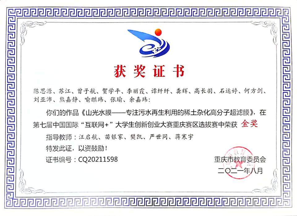 陈思源同学用自身行动践行习近平总书记提出的“创新、协调、绿色、开放、共享”新发展理念及“绿水青山就是金山银山”的理念。不断延伸和补充专业知识,努力缩短技术应用与社会需求之间的距离,形成了理论与实践的良性互动。曾多次前往重庆水务集团、中国水环境集团旗下多家污水处理企业进行市场调研,和团队成员一起创新研发“稀土杂化高分子超滤膜”,解决目前污水处理行业传统超滤膜通量低、易污染、水质差的难点,提高超滤膜通量、抗污染性,使得出水水质达到再生水标准,实现污水资源化利用。