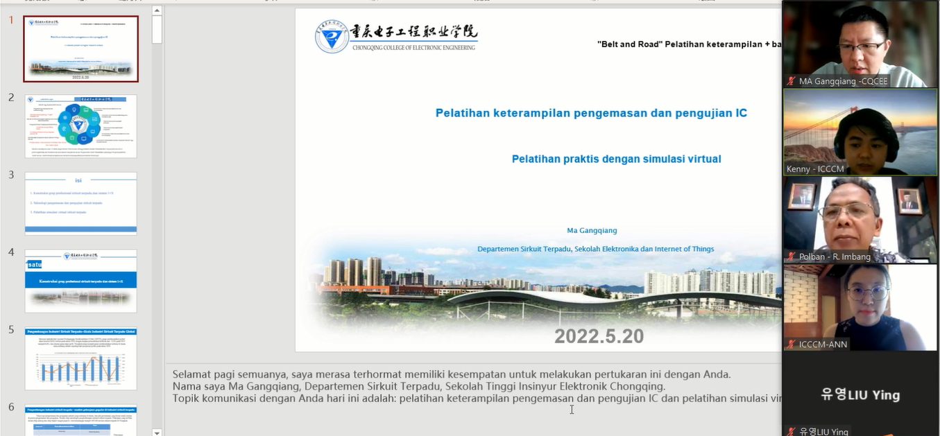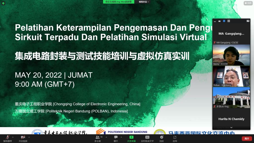 培训由集成电路系主任马岗强主讲,培训围绕集成电路人才需求、专业群建设、1+X标准、集成电路封装与测试开展,并依托我校国家级虚拟仿真实训基地开展线上实训。通过培训,印尼参培师生对集成电路专业技能、集成电路专业群建设、虚拟仿真实训教学有了较为清晰的认识和全面的了解。