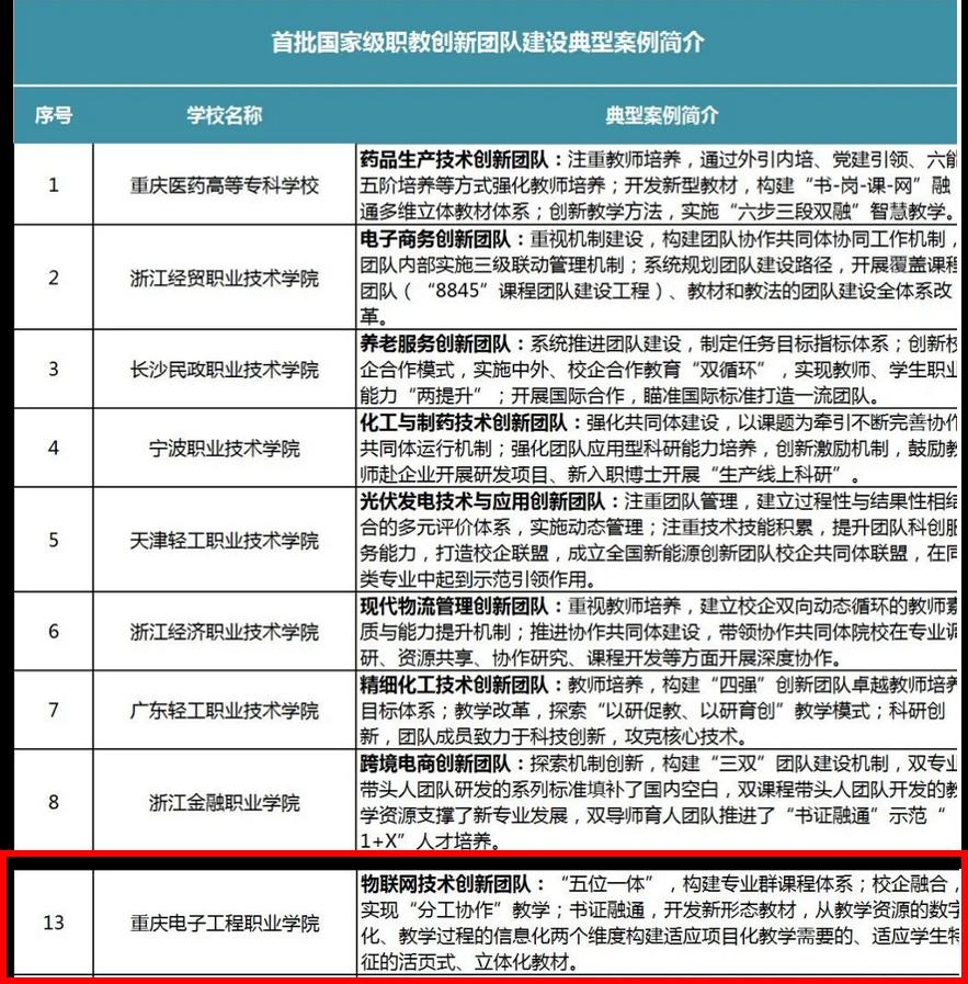 本次公布了13个省市职教教师队伍建设经验做法和30个全国职业教育教师教学创新团队建设典型案例。我校物联网应用技术专业国家级教育教师教学创新团队以“德能双修、务实协作、融合创新”为宗旨,立足职业教育高质量发展,依托物联网国家双高专业群、国家物联网产业示范基地(重庆)、陈良国家级技能大师工作室、新大陆物联网学院等优势资源,通过“大师引领、模组协同、书证融通”等举措打造模组结构化“双师协同”教师队伍,深化“三教”改革。