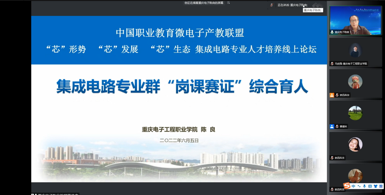 6月5日,由中国半导体行业协会、中国职业教育微电子产教联盟主办的“集成电路专业人才培养线上论坛暨2020创芯中国集成电路创新挑战赛芯片测试技术技能赛项线上启动会”顺利召开。会议以线上方式进行。来自中国半导体行业协会、赛迪研究院、杭州朗迅科技、东南大学、西安电子科技大学、浙江大学等集成电路领域的专家教授参会。电子与物联网学院院长陈良教授受邀作题为《集成电路专业群“岗课赛证”综合育人》主旨演讲,学院集成电路专业群骨干教师在线参会。