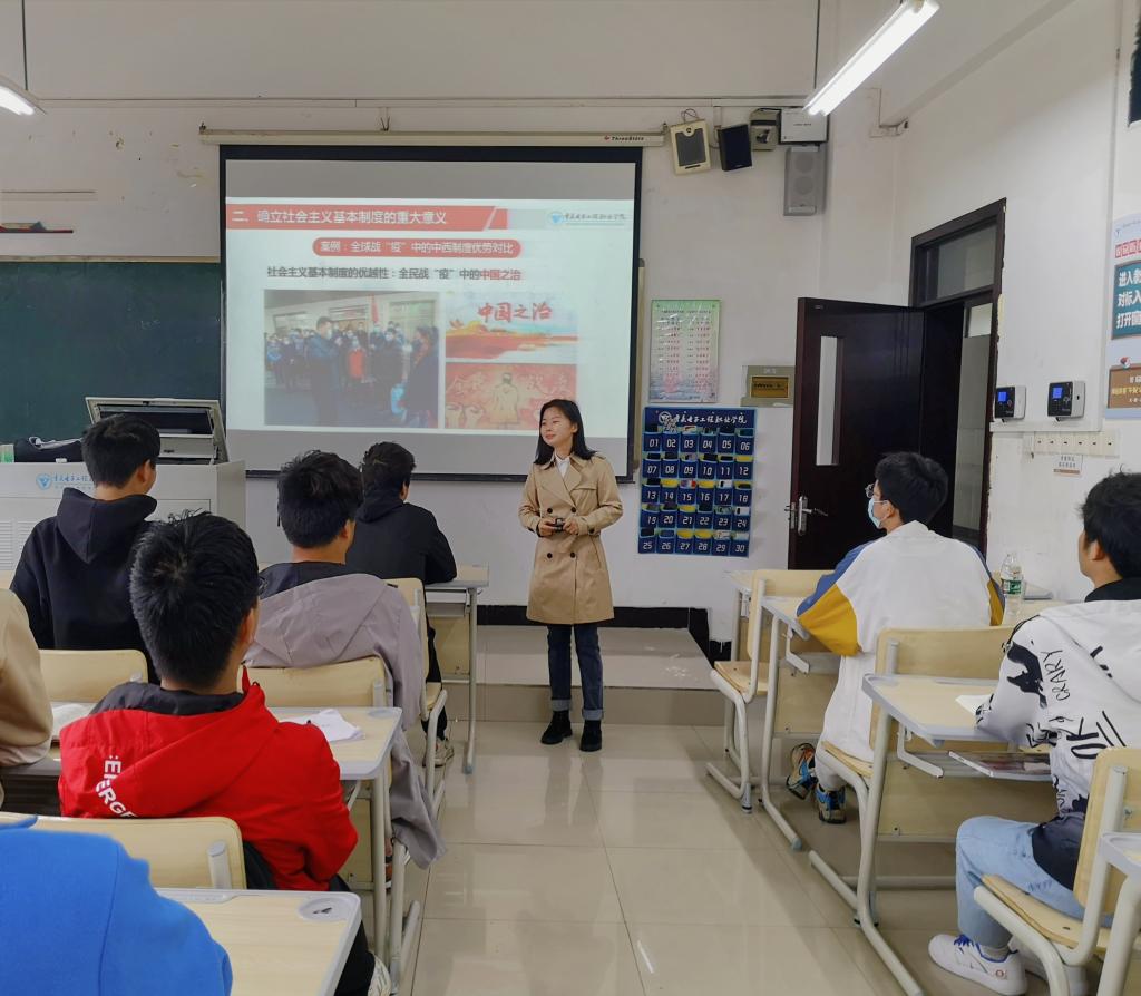 聚焦知情意行,融入防疫资源。“上思政课不能拿着文件宣读,没有生命、干巴巴的。”思政课教学必须将理论与现实实践有机结合。在疫情防控常态化背景下,学院教师团队以教育部课题为平台,坚持以学生为主体,聚焦学生思想行为转化的规律和特点,积极探索课堂教学理念和方式方法创新,将防疫这个社会热点有效融入教学,突出课堂教学的亲和力和针对性。一是聚焦学生的“知”,以中国抗疫实践和抗疫成效丰富课程理论的实践内涵,增进学生理论认知;二是聚焦学生的“情”,创新课堂教学话语,以抗疫话语独特的亲和力量激发学生情感,增强学生学习情绪体验;三是聚焦学生的“意”,以抗疫模范具备的示范作用强化学生意志品质,稳定学生由知到行的转化;四是聚焦学生的“行”,以明辨抗疫斗争的现实问题引导学生行为。