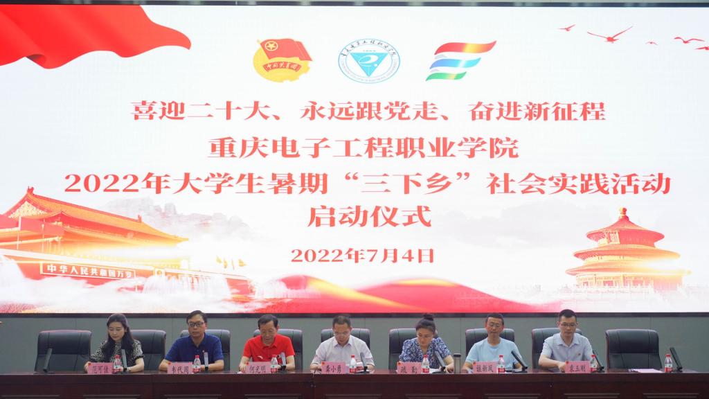 为深学笃用习近平新时代中国特色社会主义思想,深入学习宣传贯彻习近平总书记在庆祝中国共产主义青年团成立100周年大会上的重要讲话精神,引导和帮助广大青年学生上好与现实相结合的“大思政课”,在社会课堂中“受教育、长才干、作贡献”坚定信念听党话、跟党走,以优秀的成绩迎接党的二十大胜利召开。7月4日,重庆电子工程职业学院“喜迎二十大、永远跟党走、奋进新征程”大学生志愿者暑期文化科技卫生“三下乡”社会实践活动出征仪式在博远厅顺利举行。党委副书记龚小勇,党委委员、党委宣传部部长疏勤,党委学工部部长何光明,安全管理处处长谯新风,马克思主义学院党总支书记韦代周,校团委书记袁玉刚出席本次会议。会议由校团委副书记范可佳主持。