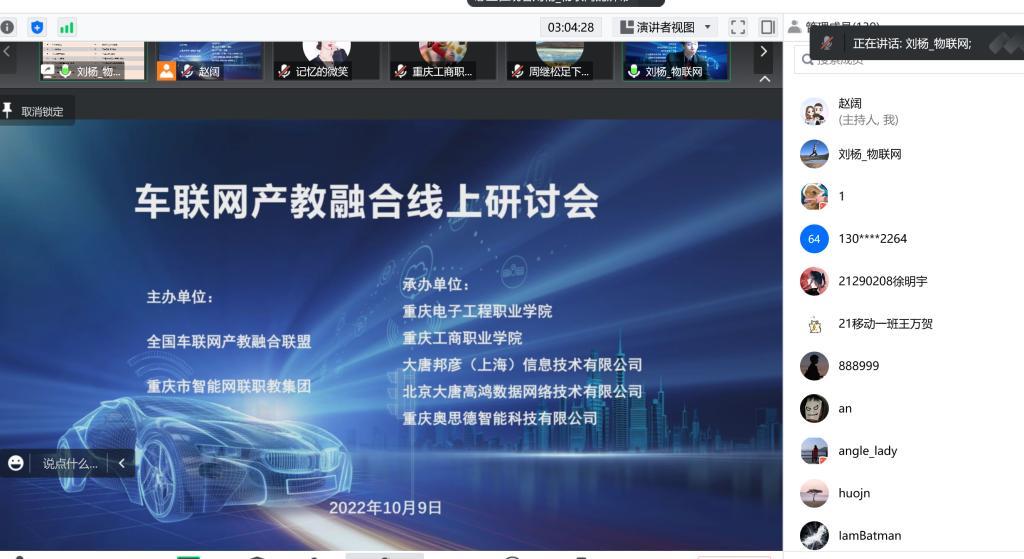 2022年10月9日,由全国车联网产教融合联盟、重庆市智能网联职教集团主办,重庆电子工程职业学院、重庆工商职业学院、大唐邦彦(上海)信息技术有限公司、北京大唐高鸿数据网络技术有限公司、重庆奥思德智能科技有限公司承办的车联网产教融合线上研讨会顺利举行。