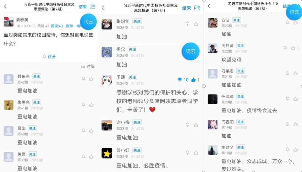 姜老师在思政课上,引导学生在面对突如其来的校园疫情时,要坚定信心、保持镇定,不能懈怠,更不能恐慌,要积极配合疫情防控工作,做好自身健康的第一责任人。重电师生的并肩同行、众志成城,定能尽快战胜疫情,坚信在不久的将来,重电校园将恢复欢声笑语和勃勃生机,迎来疫消云散的最美秋天。