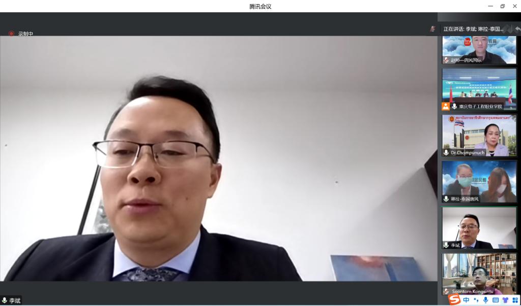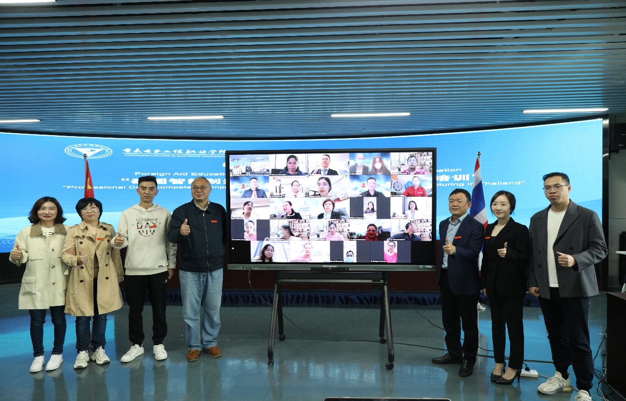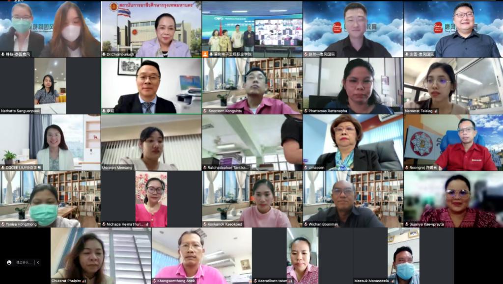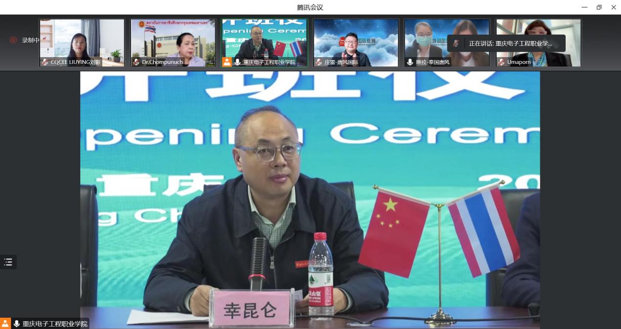 2022年10月25日上午,我校立项的中国教育部国际司教育援外项目“泰国智能制造领域人才专业核心能力提升培训”,在重庆市教育委员会和泰国教育部职业教育委员会曼谷教育中心的大力支持下顺利开班。参加此次线上开班仪式的有:泰国教育部职业教育委员会曼谷职业教育中心(IVEB)主任冲普努·波邦松、副主任乌马彭·猜扎棱;重庆市教育委员会国际合作与交流处处长李斌;重庆电子工程职业学院副校长幸昆仑;北京唐风国际教育集团业务总监庄雷及相关人员共24人。开班仪式由重庆电子工程职业学院培训与继续教育学院院长莫绍强主持。