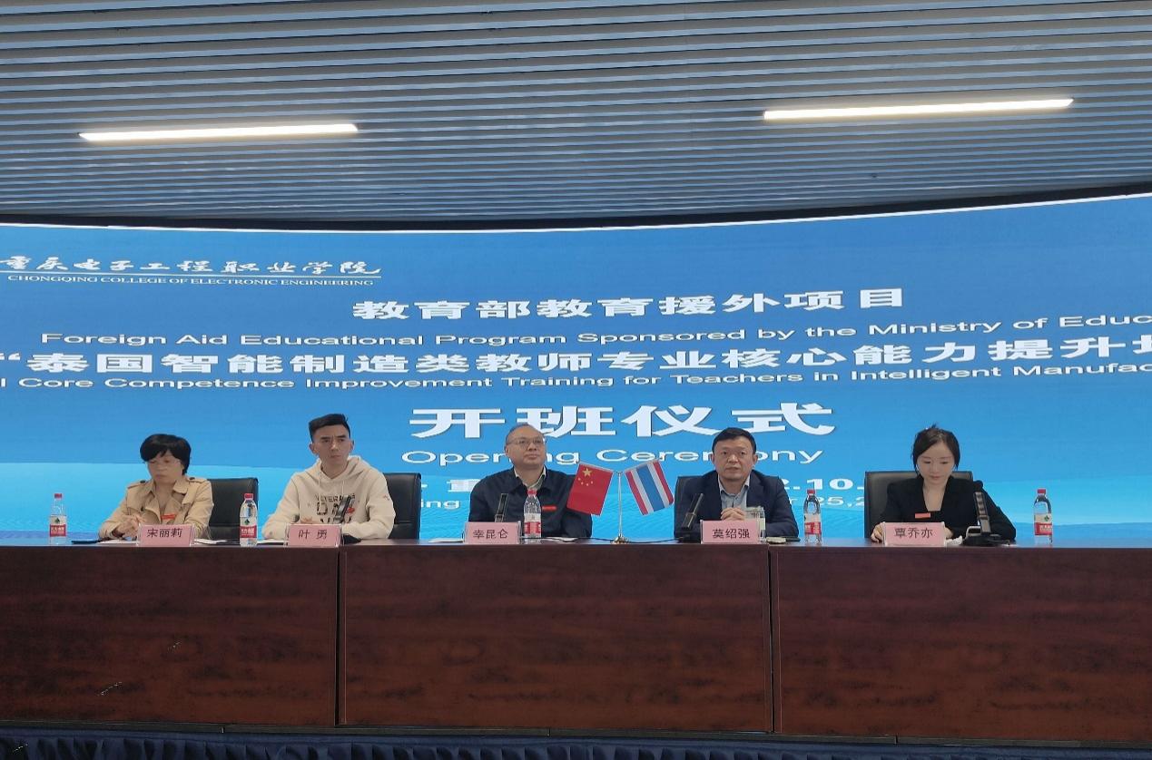 开班仪式上,泰国曼谷职教中心主任冲普努·波邦松、重庆电子工程职业学院副校长幸昆仑、唐风国际教育集团业务总监庄雷、重庆电子工程职业学校智能制造与汽车学院院长叶勇、重庆市教育委员会国际合作与交流处处长李斌、泰方学员代表孙同·孔欣图分别致辞并代表讲话。作为主办方,副校长幸昆仑在致辞中介绍了双方历年来的合作成果,通过“互联网+”平台为技术载体,力求为泰国职教委培养更多通晓智能制造领域专业技能、服务中泰产业发展的人才。通过本期培训项目,将进一步与泰国开展深度合作,为学校建立协进共赢、常态高效的国际教育合作机制,孕育多层次、宽领域的教育交流合作平台提供宝贵资源。