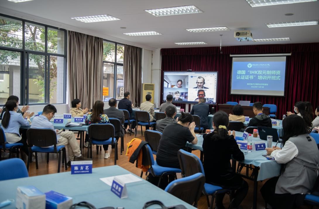 在为期三周的培训过程中,采用在线直播课+线下课题研讨的形式进行。德方专家将严格按照德国职业教育师资从业标准、围绕德国双元制职业教育中四项核心行动领域(职业教育的资格审核及教学方案设计、职业教育的规划及招生、职业教育的实施、职业教育的结业)设置课程内容,为学员详细讲解德国职业教育的办学模式和发展思路,为重庆市职业教育改革和国际化教学能力提升提供理论支撑与经验参考。学员顺利结业并通过由IHK马格德堡考试委员会组织的统一考试后,将获得由IHK颁发的国际化教学能力认证证书。