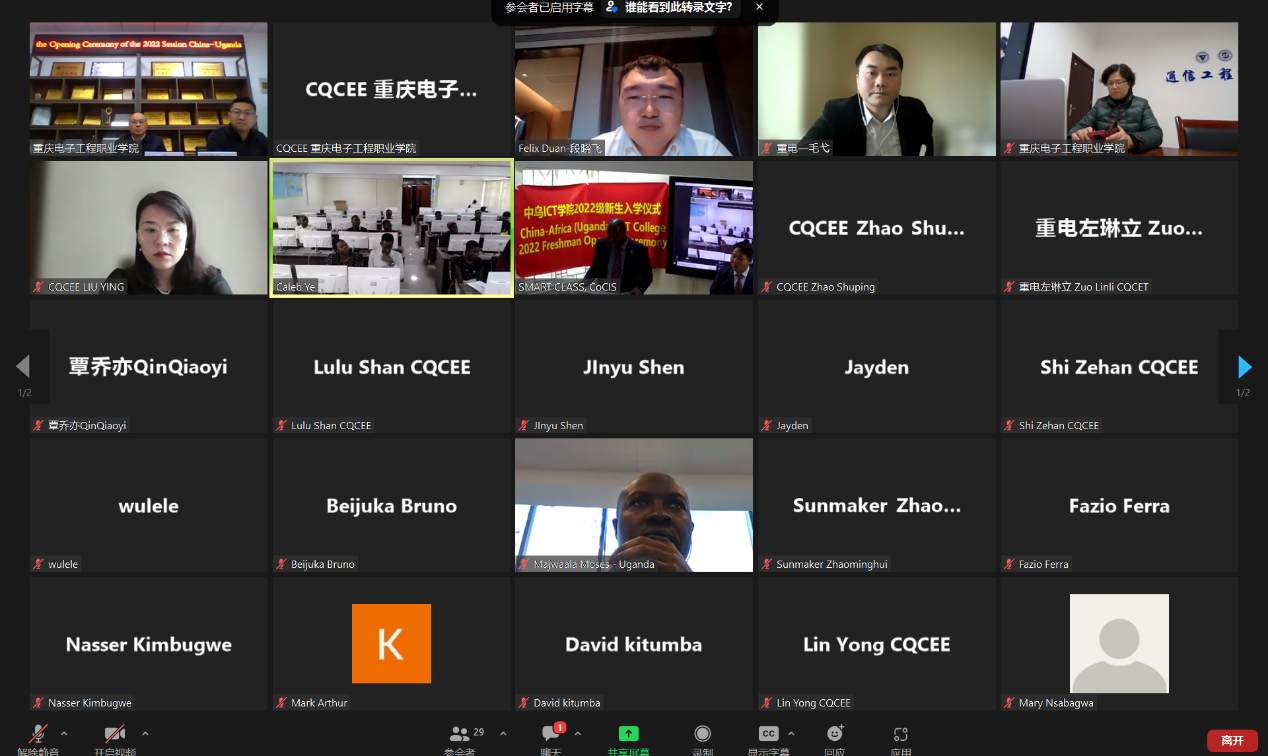 11月14日,第二届中乌鲁班工坊开学典礼以线上方式在中乌两地同步进行。重庆电子工程职业学院副校长幸昆仑、创造太阳乌干达石油学院副校长段晓飞、乌干达麦克雷雷大学计算机工程学院院长托尼·奥雅纳,重庆电子工程职业学院通信工程学院院长陶亚雄、电子与物联网学院党总支副书记毛弋、国际交流与合作发展处副处长刘影、教师代表赵淑平,乌干达麦克雷雷大学教师代表东戈·史蒂文·埃约布以及全体留学生一同出席开学典礼。典礼由重庆电子工程职业学院国际交流与合作发展处处长刘宏宇主持。
